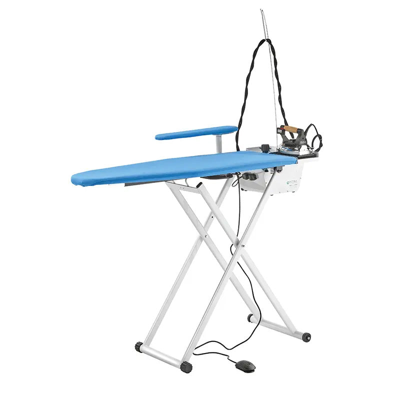 Battistella Prometeo Tavolo da stiro aspirante, riscaldato (cm 121x44), pieghevole, completo di ferro da stiro EOS, caldaia inox da 2 lt. utili, doppia valvola di sicurezza, termostato di sicurezza in caso di avaria e rubinetto di scarico.