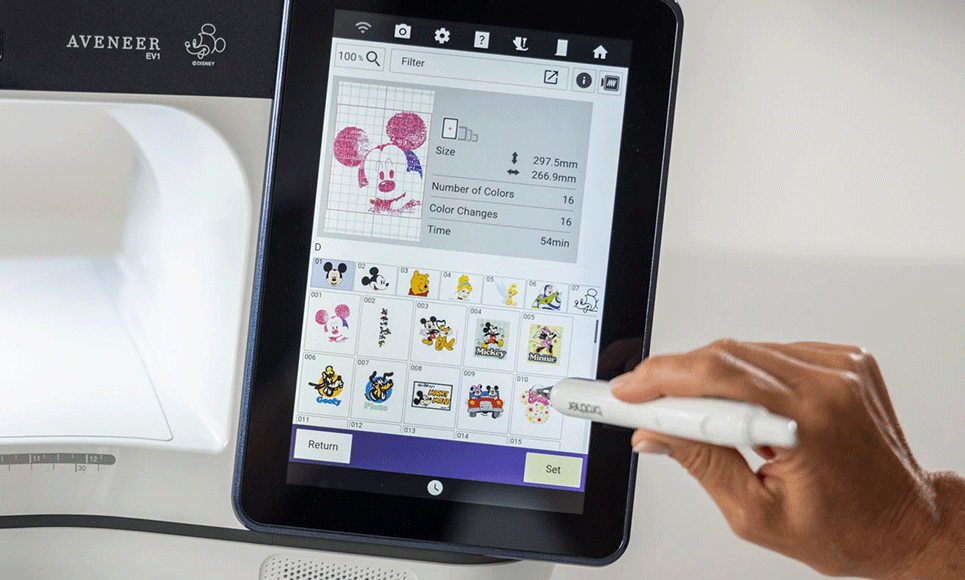 Aveneer trasforma i tuoi sogni creativi in realtà con la semplice pressione di un pulsante. Trasforma le tue foto più belle in ricami d'autore con la funzione AI Picture Play Embroidery. Converti le immagini scansionate in ricami e disegna i tuoi ricami e punti direttamente sullo schermo di EV1.