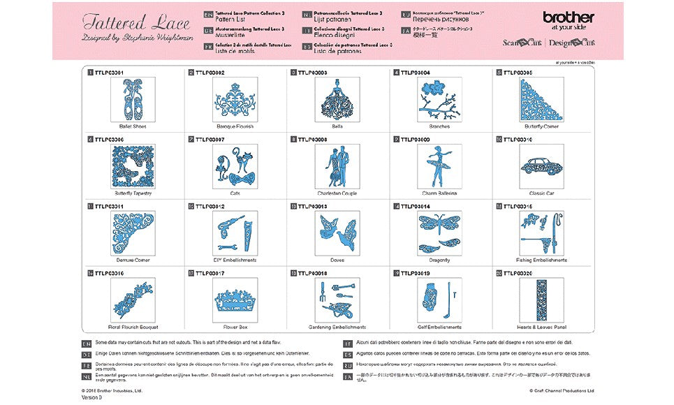 Elegante e sofisticata collezione di file di taglio di Brother, progettata dall'artista Stephanie Weightman. Stupisci con bellissime miniature filigranate: scarpette da ballo, farfalle, fiori, pesca, golf e altro ancora.
