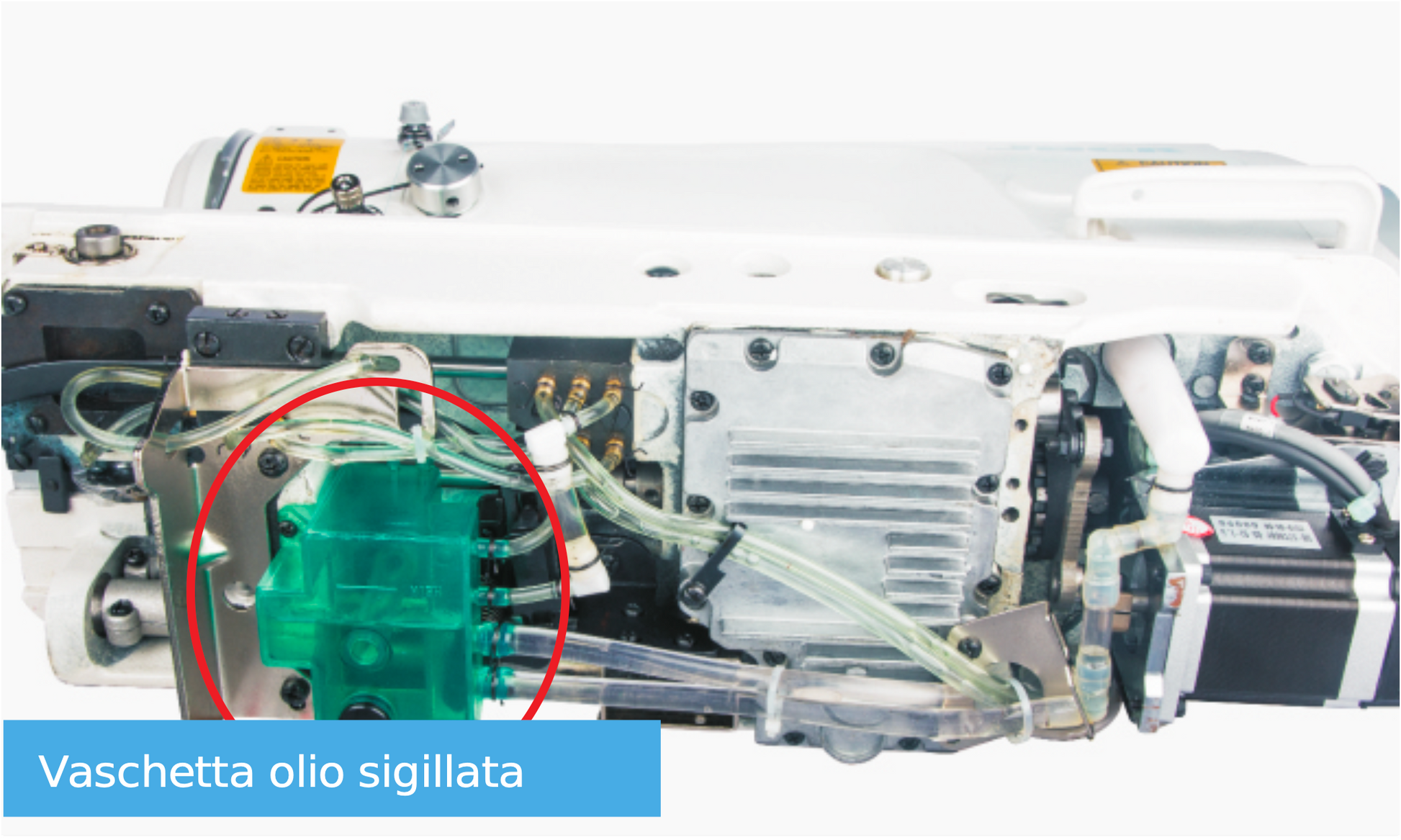 Dotata di una vaschetta di olio sigillata, per la sola lubrificazione del crochet. La barra ago e gli altri componenti sono lubrificati attraverso un sistema di micro-lubrificazione, che previene da macchie e perdite.