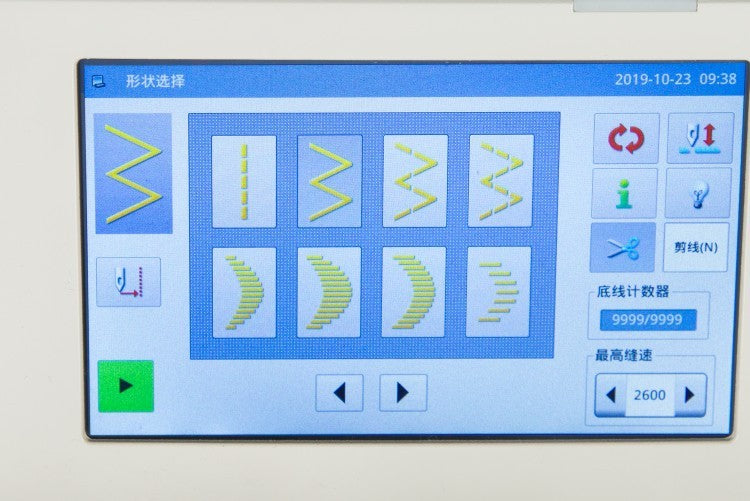 La macchina è dotata di un grande pannello tattile LCD e Le icone sul display sono intuitive e facili da capire. Fornita di una lista di pattern e di una memoria di pattern, l’utente può direttamente selezionare il motivo di cucitura desiderato dal pannello, senza dover modificare. Con il pulsante (in figura) che consente la conversione del punto conchiglia, quando si giunge all’angolo .