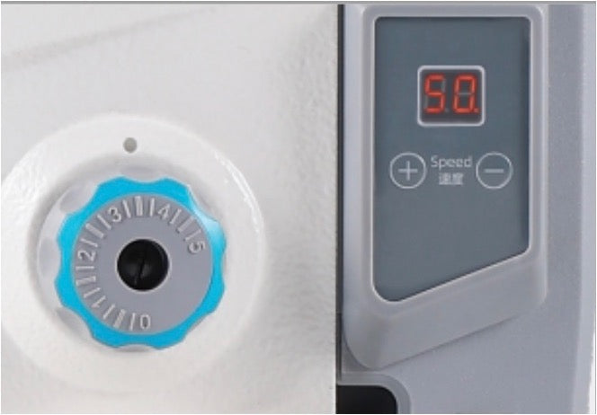 Con i tasti + e – puoi regolare la velocità digitalmente e puoi impostare la posizione dell'ago.