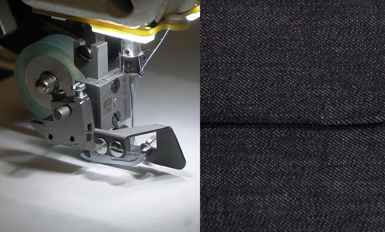 Macchina per ribattitura cintura pantalone per cucitura invisibile con puller ravvicinato controllato dal pannello digitale, piedino compensatore doppio con prua molleggiatal e bancale a sbalzo.
