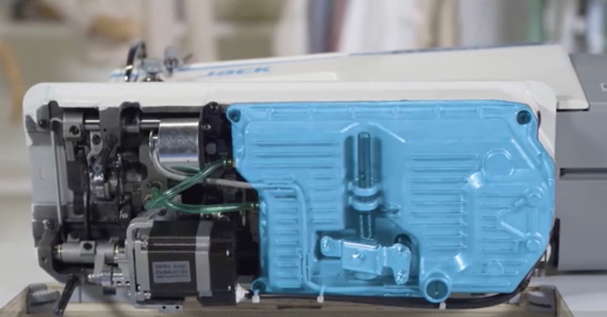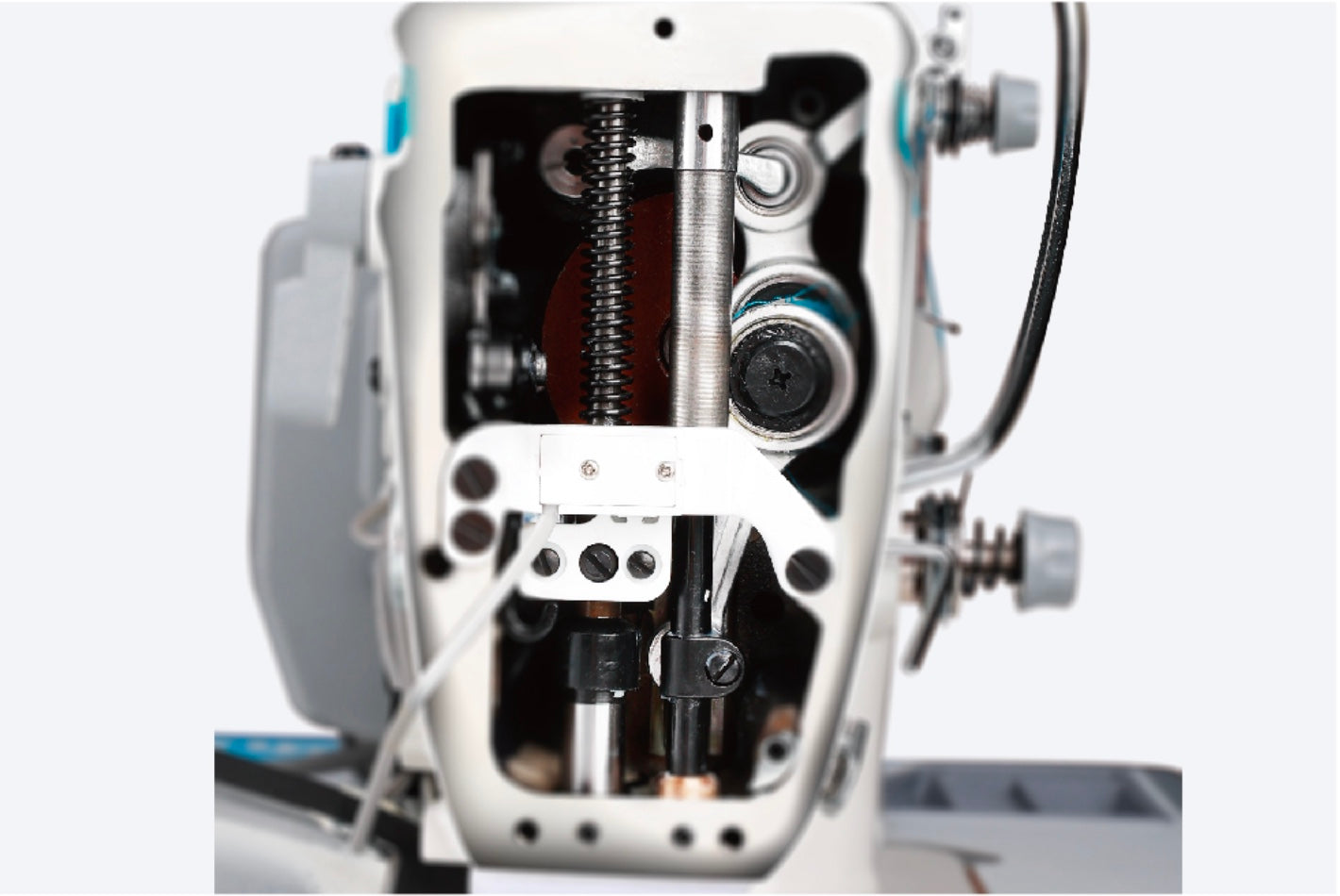 Lineare con movimento della griffa digitale, rilevamento spessore tessuto, braccio maggiorato da 300mm, taglio del filo corto a doppio coltello (3mm), testa secca, alzapiedino automatico, regolazione digitale del punto, fermatura digitale silenziosa e motivi di cucitura. Apridischi tensione elettrici, bussola barra d'ago allungata. Bacinella olio sigillata e motore integrato.
