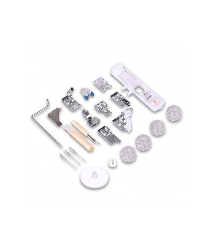 Accessori in dotazione: Piedino standard, Piedino per cerniere, Piedino per asole, Piedino per punto satin, Piedino per cucire bottoni, Piedino sopraggitto, Piedino orlo invisibile, Piedino orlo arrotolato, Piedino arricciatore, Guida bordo/trapunta, Apriasola/Scucitore/Spazzolina, Confezione di aghi (# 11, # 14, # 16), Fermaspola grande, Fermaspola piccolo, Spoline (4x), Cacciavite a L, Copertina morbida. Non contiene l’oliatore, ai sensi delle vigenti normative.