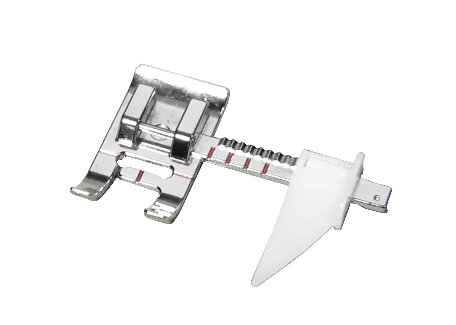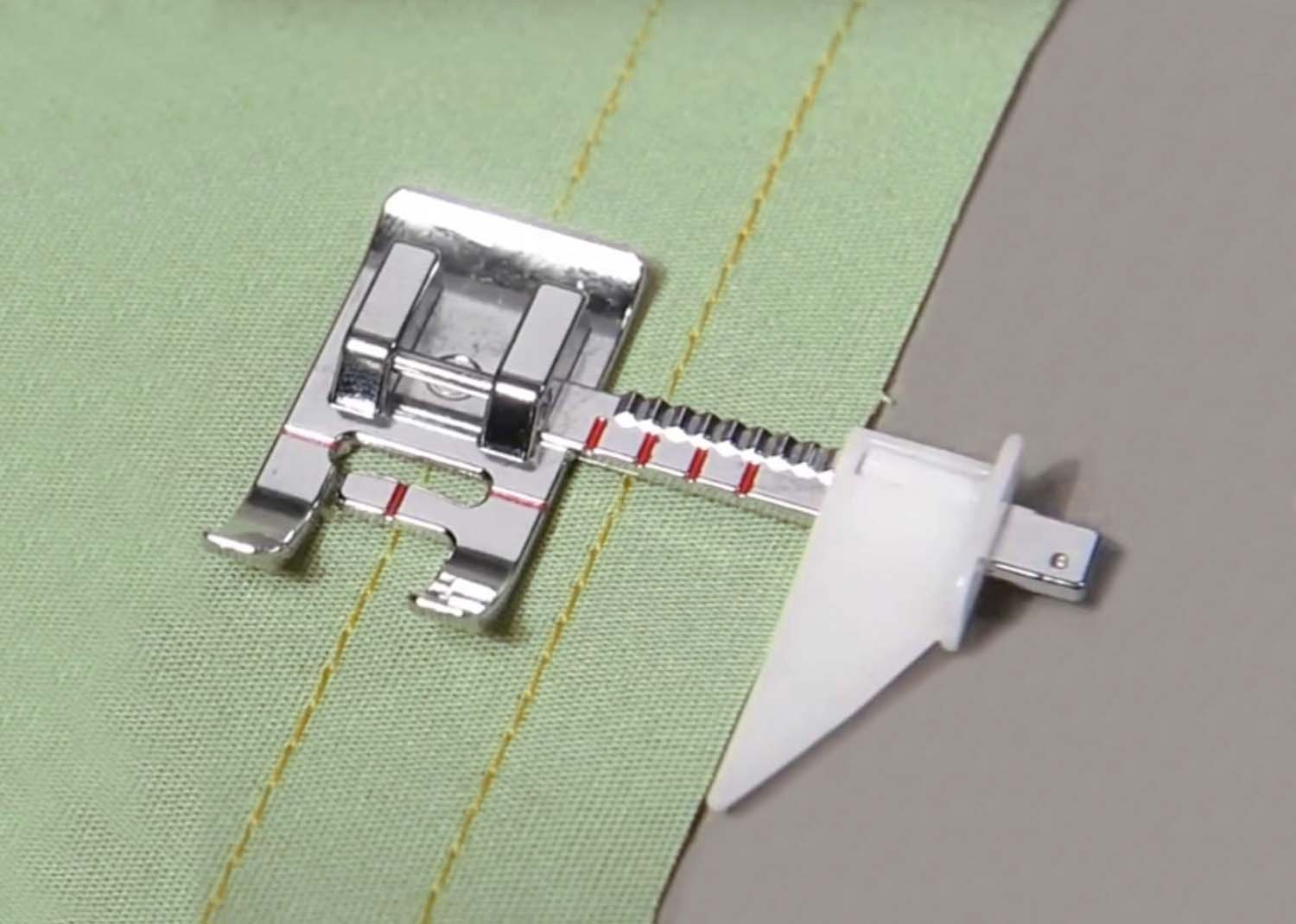 La guida di questo piedino si regola molto facilmente per offrire un ampia scelta distanziando le cuciture per ottenere linee perfettamente parallele. La guida possiede punti di riferimento millimetrati che vi aiuteranno nella ricerca della distanza giusta.