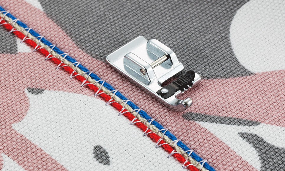Il piedino per cordoncino a 3 fori consente di fissare e cucire il cordoncino in un unico passaggio. Permette l'inserimento di cordoncini trattenuti dalla clip dentata, cucendo il cordoncino con punto zig-zag o altro punto decorativo.