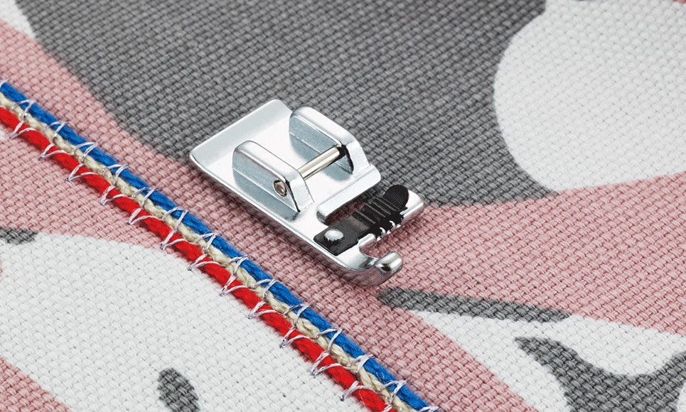 Questo piedino consente di cucire fino a tre cordoncini o fili decorativi. Basta inserire i cordoncini sotto la clip e cucire con un punto zig-zag o decorativo.