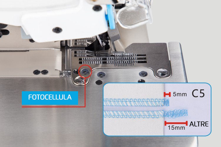 Macchina tagliacuce pneumatica avanzata ad alta velocità pneumatica con 3 fotocellule integrate per cucitura automatica. Rapida risposta in accelerazione e decelerazione aumentata del 50%. Selettore leggero/medio/pesante per adattare la macchina al giusto tipo di tessuto. Taglio corto frontale e posteriore a 5mm. Disponibile con dispositivi come aspira taglia catenella e rientro catenella.