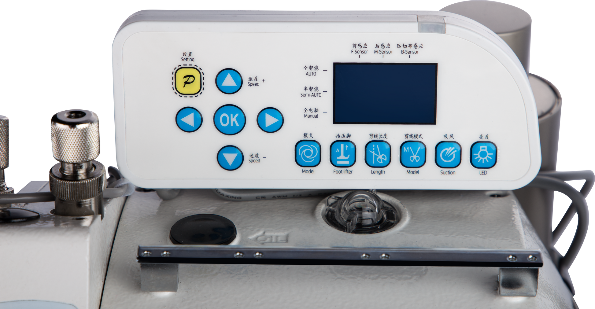 E' stato aggiunto un display LCD per poter controllare le nuovi funzioni come la cucitura automatica, le fotocellule e la trancetta da pannello.